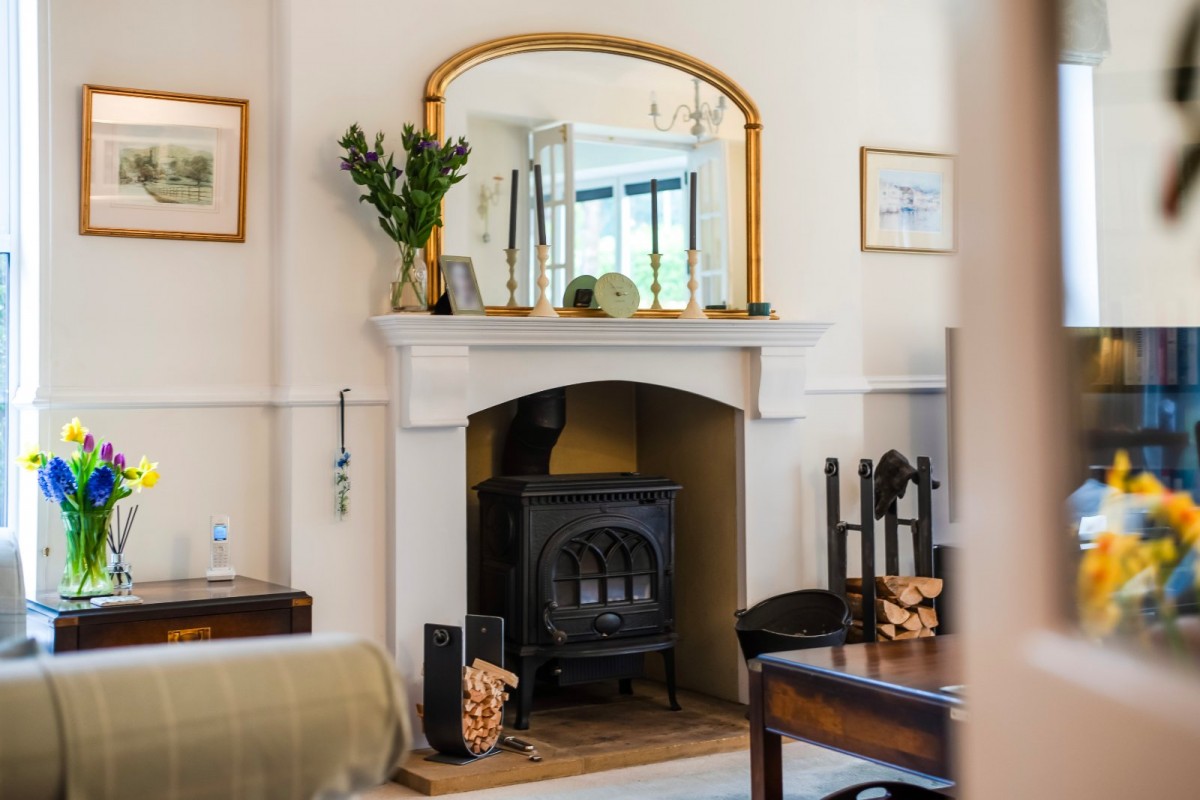 A covered porch opens into a spacious entrance hall with wooden flooring, cloakroom and stairs to the first floor. At the front are a study and family room. A standout feature is the bright, good sized kitchen/dining room with refitted units, island with breakfast bar, two built in double ovens and a six burner gas hob with extractor. Bifold doors open directly onto the garden. A door leads to the utility room and additional cloakroom, and glazed double doors connect to the lounge. The lounge is an attractive double aspect room, approached down two steps, featuring sliding doors to the garden and a fireplace with inset solid fuel stove.